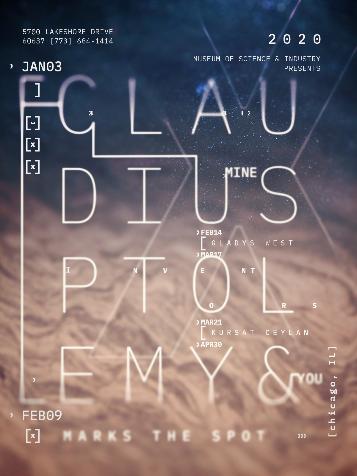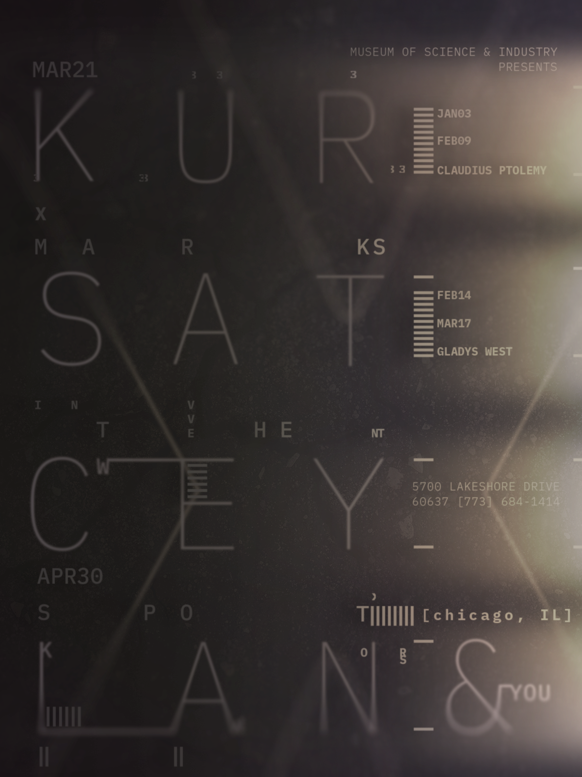 A typographic poster series that invites museum goers to an event at the Museum of Science & Industry, highlighting the featured subjects of the exhibit.