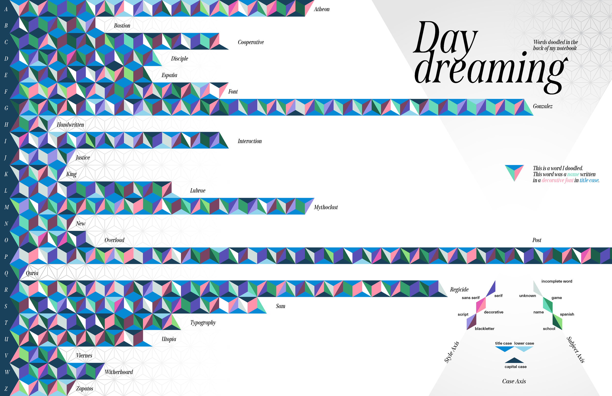 A data-driven info-graphic displaying data on the most common words doodled in the backs of my notebooks, as well as the font, subject category, and case.